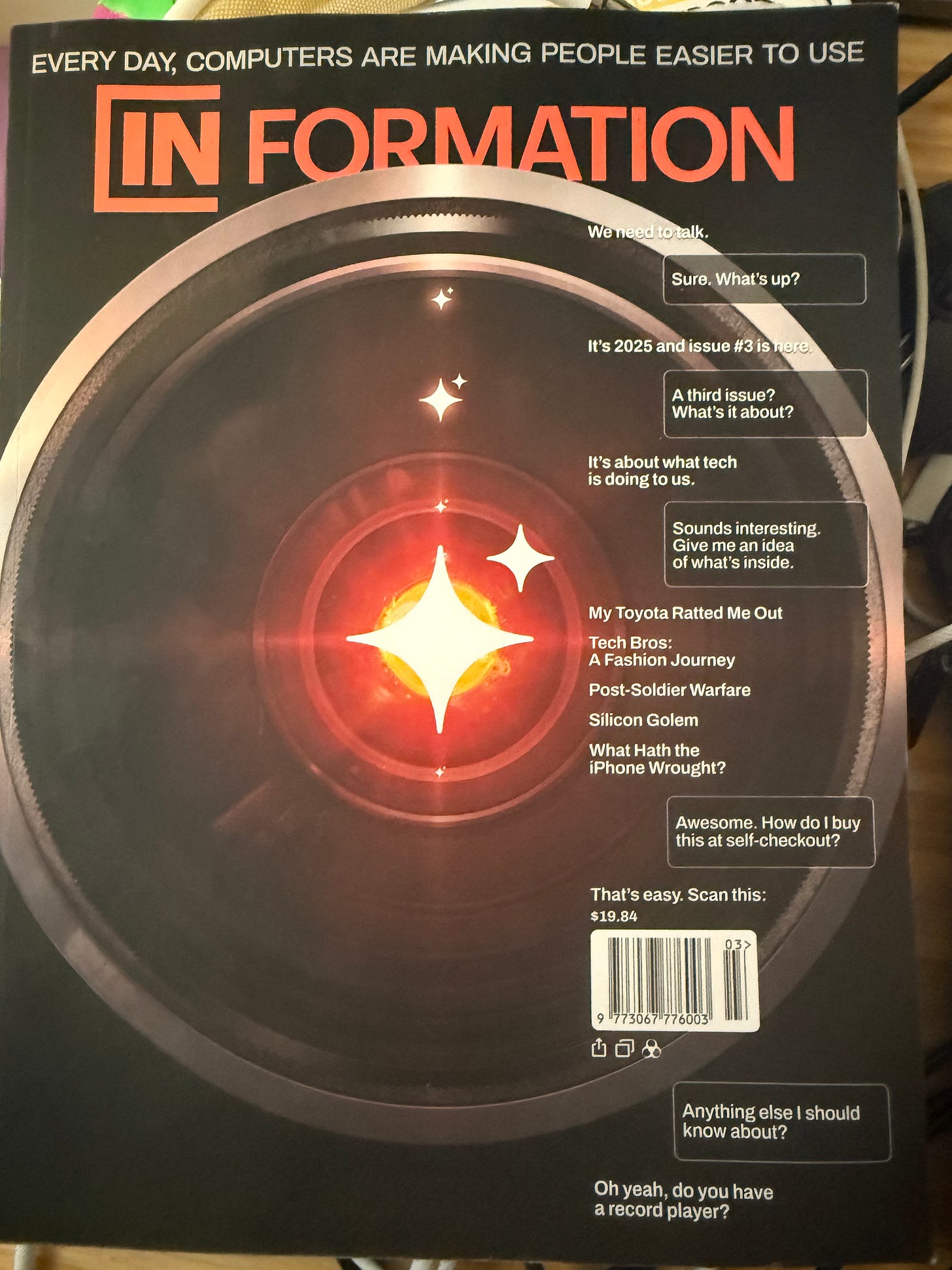 The first issue of In Formation was published in the summer of 1998. The New York Times hailed it as “the anti-WIRED.” The magazine’s tagline, “Every day, computers are making people easier to use,” came across as “acutely paranoid” at the height of the midst of the first dotcom boom. The second issue, a “special apocalypse issue” was released two years later. The apocalypse in question being Y2K. Then the dotcom crash happened, and In Formation’s writers became occupied with other things. They recently decided to get the old band back together. I’m so glad they did. (Read John Sundman for more of the backstory. It’s a real treat.)
