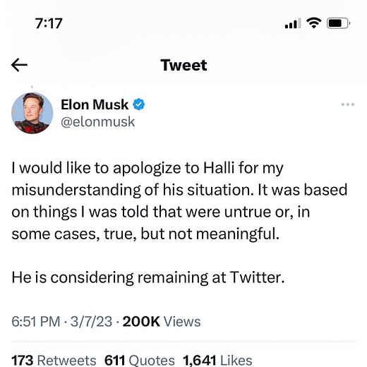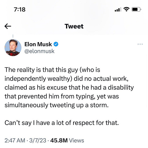 Just today, Musk picked a fight with former (?) employee Haraldur Thorliefsson. Sixteen hours after bragging that he had fired Thorliefsson because of his disability (Thorliefsson has muscular dystrophy), Musk tweeted that he had jumped on a video call with him, “better to talk to people than communicate via tweet,” and issued a half-assed apology.