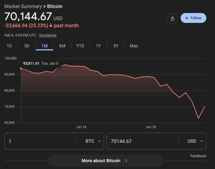 Cryptocurrencies are crashing right now. You love to see it. A few months ago, the price of bitcoin was close to $125,000. Last night it hit a low of $60,000. It has bounced back to around $70,000 now. The chart below is just the past month. It’s probably too early to declare another “crypto winter” (don’t jinx this, folks!), but it’s clearly more than just a blip.