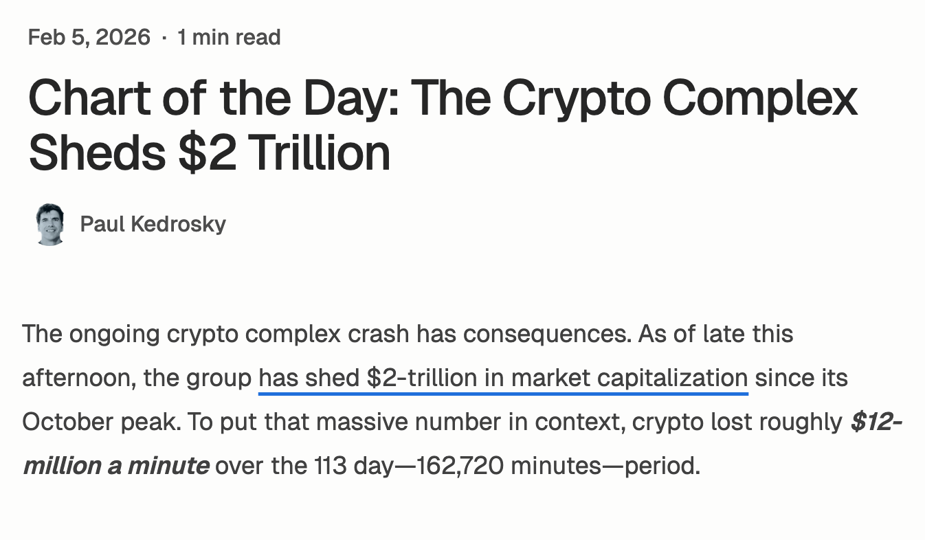 Paul Kedrosky flagged yesterday afternoon that the broader crypto ecosystem has shed $2 trillion.