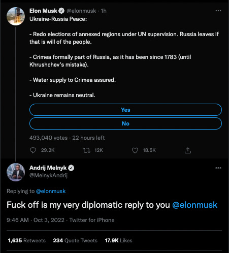 And yesterday, Musk decided it was time to end the war in Ukraine… via Twitter poll.